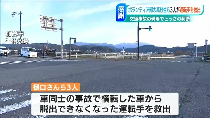 新潟県加茂市で発生した交通事故で、自力で脱出できなくなった車の運転手を救出した高校生ら3人が警察から表彰されました。日頃の活動が活かされた勇気ある行動でした。