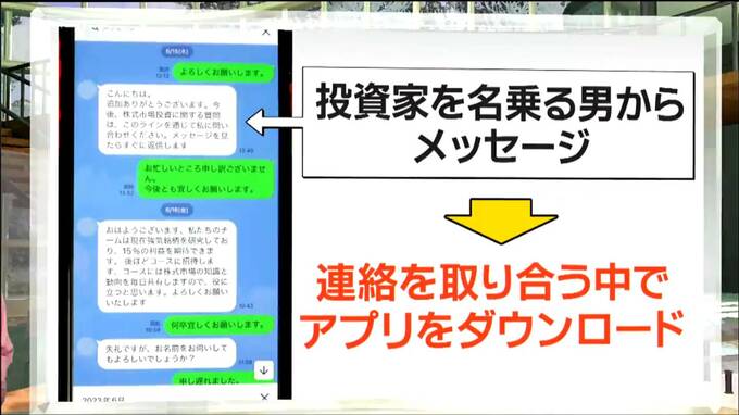 金融商品詐欺の犯行の手口では、被害者がSNSで投資の記事を閲覧中に投資家を名乗る犯人から直接メッセージが来ました。その後、連絡を取り合うなかで投資に必要なアプリをダウンロードするように指示され、男性はアプリを通じて指示通りに投資をするようになりました。そうするとアプリには利益を表す表示が出たということです。しかし、その後アプリは使えなくなり、犯人との連絡も途絶えました。犯人とSNSで1対1のやりとりになってしまうと、話を信用してしまうケースも多くなるといいます。