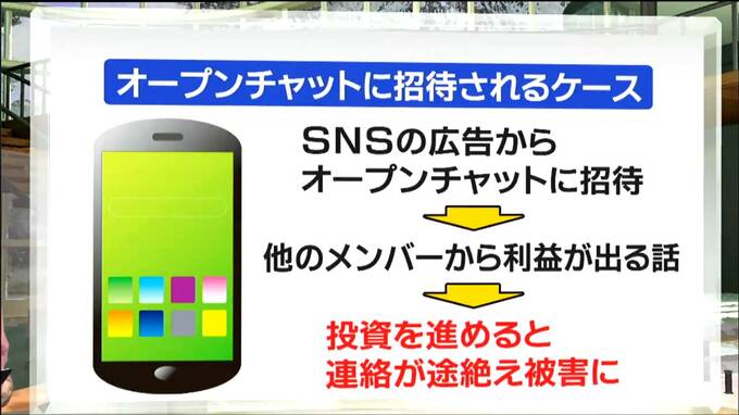 このほかにも、SNSの広告から投資についてのオープンチャットに招待されるケースもあります。オープンチャットの中で他のメンバーから利益が出る話があり、投資を進めると連絡が途絶え、被害に遭ってしまうことが多いということです。