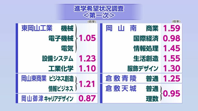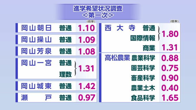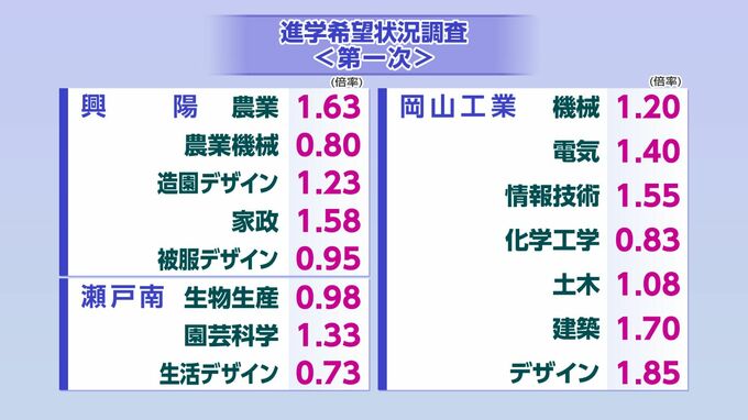 このうち倍率が最も高かったのは、岡山工業(デザイン)の1.85倍で、次いで西大寺(普通・国際情報)の1.80倍、岡山工業(建築)の1.70倍、水島工業(機械)の1.68倍、高松農業(食品化学)の1.65倍です。