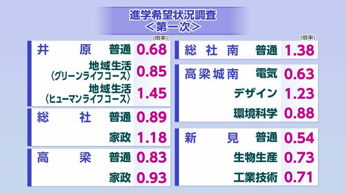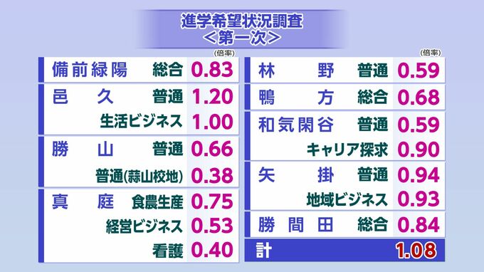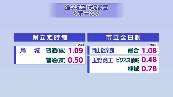 県立定時制の烏城は昼間部が1.09倍、夜間部が0.50倍。市立全日制の岡山後楽館は1.08倍となっています。