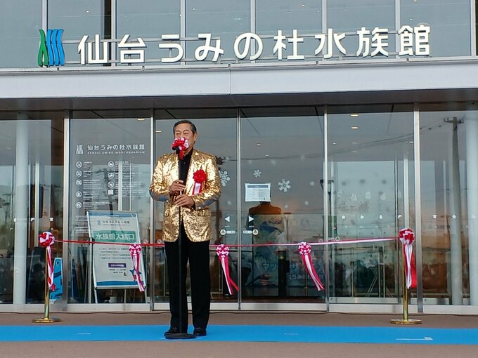 仙台市宮城野区の仙台うみの杜水族館では記念のセレモニーがあり、「マツケンサンバII」を歌う松平健さんが登場しました。
