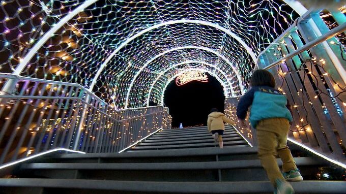 今年は7万7000個のLEDライトで、華やかな光のトンネルや高さ18メートルのツリーを作りあげています。