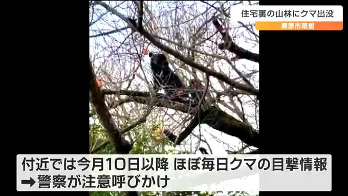 宮城県栗原市築館で15日午前、住宅裏の山林にクマ1頭が出没しました。この付近では、今週に入ってから、毎日のようにクマの目撃が相次いでいて、警察が注意を呼びかけています。カキの木に登って立ち上がるクマ。…