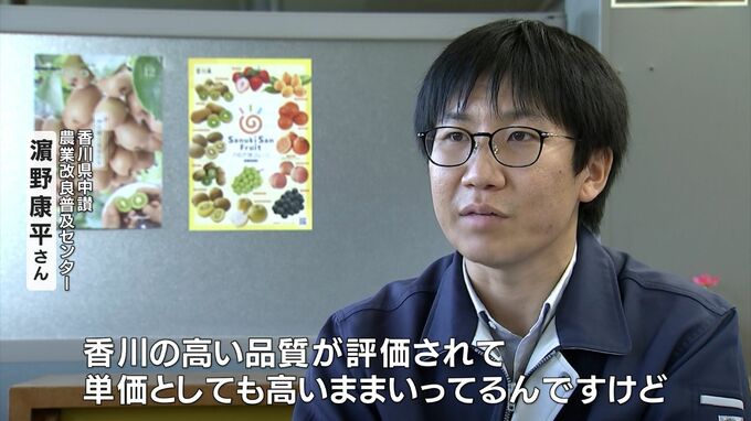 (香川県中讃農業改良普及センター 濵野康平さん)「香川の高い品質が評価されて、単価としても高いまま行ってるんですけど、まだまだ需要も今後増えていくと思われますし、生産量を増やしていくべきかなと。生産量が増えてくると、より多くの人に善通寺産のキウイフルーツを届けることができますので、それで産地としての知名度もどんどん上がっていけばいいかなと考えています」