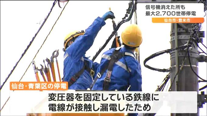 東北電力ネットワークによりますと青葉区で起きた停電の原因は、変圧器を固定している鉄線に電線が接触し漏電したためとしています。