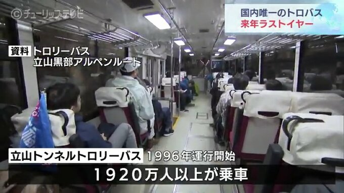 富山県の立山黒部アルペンルートの立山トンネルトロリーバスは、室堂駅から大観峰駅までの3.7キロをつないでいて、1996年の運行開始からおよそ28年間で1920万人以上が乗車しました。