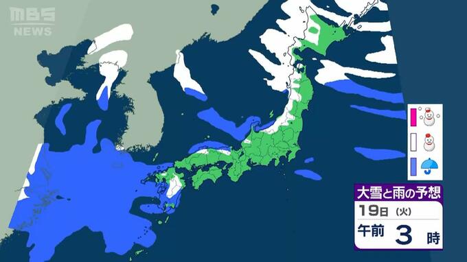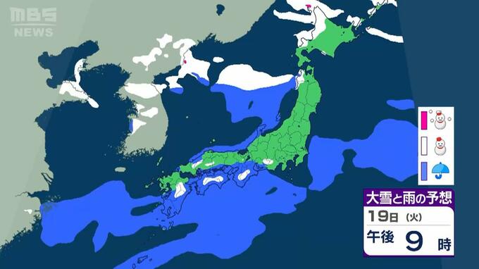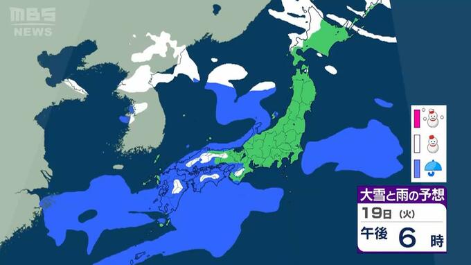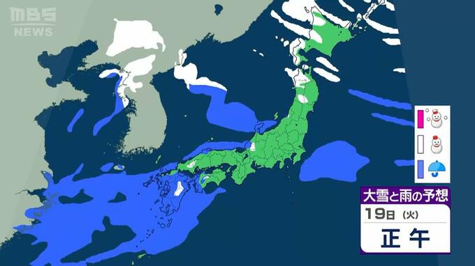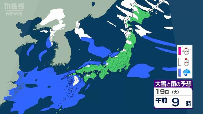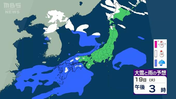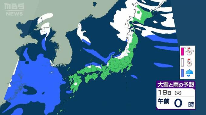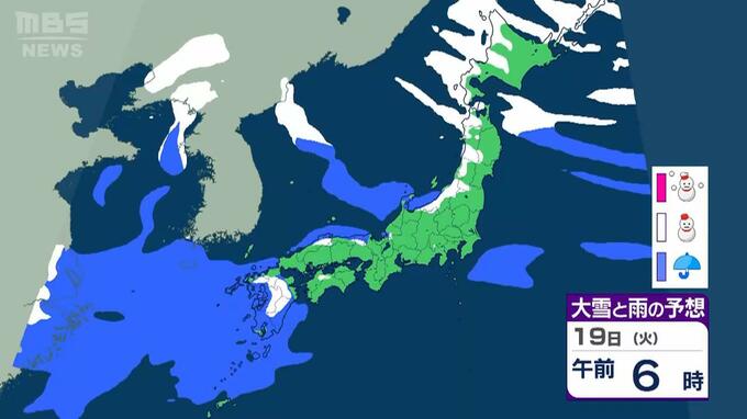 「10年に一度レベルの低温・大雪」のおそれ 20日以降寒気さらに強まる 17~18日にかけ「最大70センチ」降雪予想の所も 毎日放送 2023年12月17日(日) 06:00 国内 【12月19日の大雪と雨のシミュレーション】