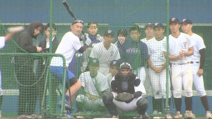 イチローの代名詞でもある“振り子打法”の原点を語った。さらに1年生の佐渡山大響選手(右打者)も駆け寄ってきた。