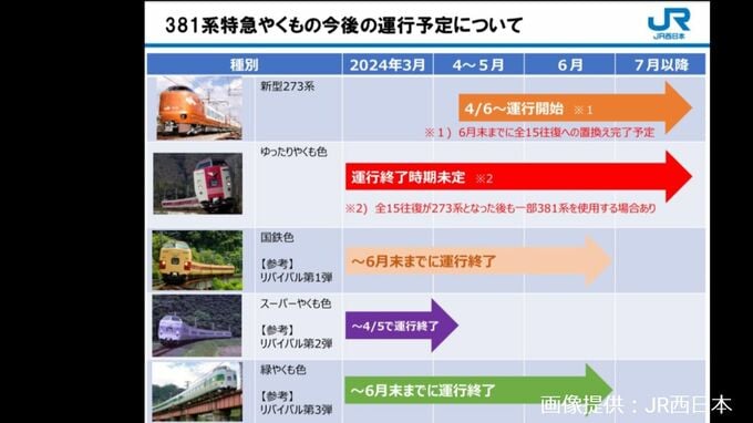 JR西日本では現在、リバイバル企画も含めてあわせて4色の車両を使用していますが、その運用時期の終了について、以下のように計画しているということです(一目で分かりやすく【画像⑤】に一覧表も掲載。)