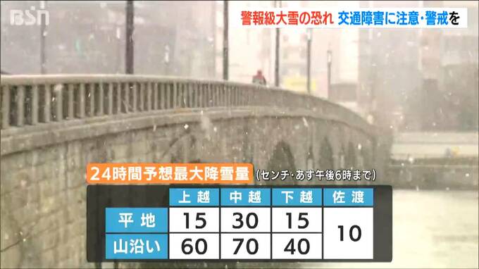 新潟県内では18日にかけて警報級の大雪となる恐れがあり、新潟地方気象台は上越と中越の山沿いでは18日明け方にかけて、大雪による交通障害に注意・警戒するよう呼び掛けています。冬型の気圧配置が続き県内では大…