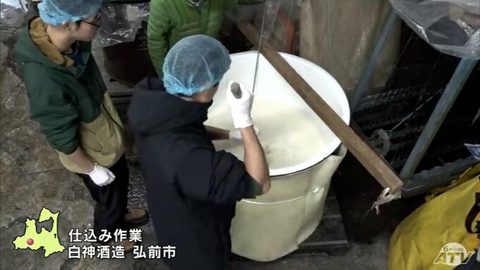 青森県青森市の大学生が弘前市の酒造会社などと協力してオリジナルの日本酒づくりに取り組んでいます。17日は青森大学の学生たちが、弘前市の白神酒造の酒蔵でオリジナルの日本酒=「純米吟醸青森大学」の仕込み作…