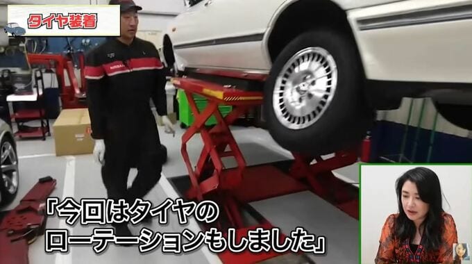 伊藤さんは車検の映像を見ながら「まず最初が下回りの確認。次はタイヤを外して『今回はタイヤのローテーションもしました。』と言ってたので、多分、前後左右変えているかな。なんかタイヤの減りが均等になるらしいです。」と、語りました。