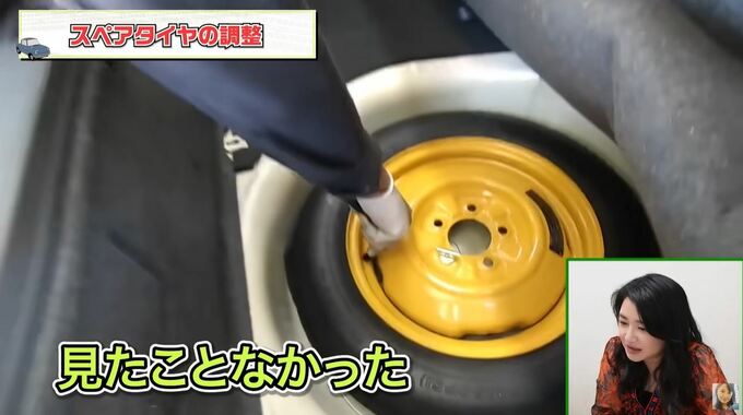 更に「タイヤの空気圧の調整。(タイヤを)外してやるんだね。スペアタイヤの調整…」と語ると、トランクの中に入っていたスペアタイヤの映像に「あ!こんなのが入ってるんだ!!見たことなかった。」と驚いた様子。