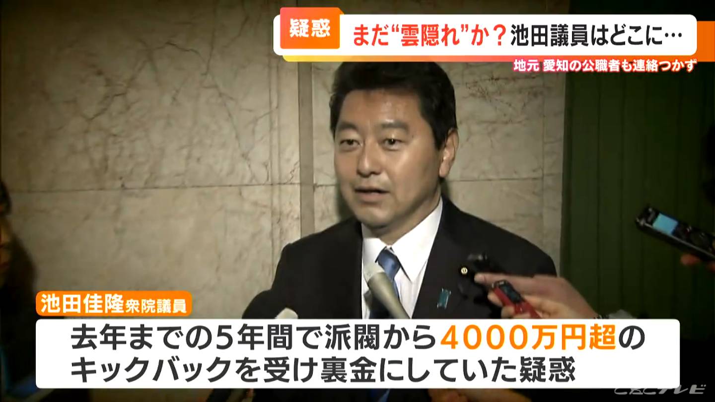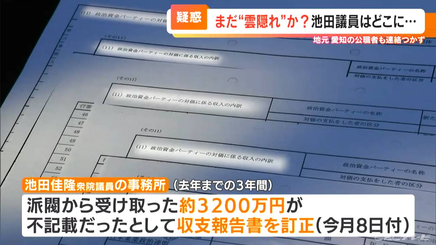 池田議員の事務所は、去年までの3年間で、派閥から受け取ったおよそ3200万円を記載していなかったとして、12月8日付けで政治資金収支報告書を訂正していますが、疑惑発覚後、本人と地元愛知の公職者や、党の関係者らとも連絡がつかない状態です。