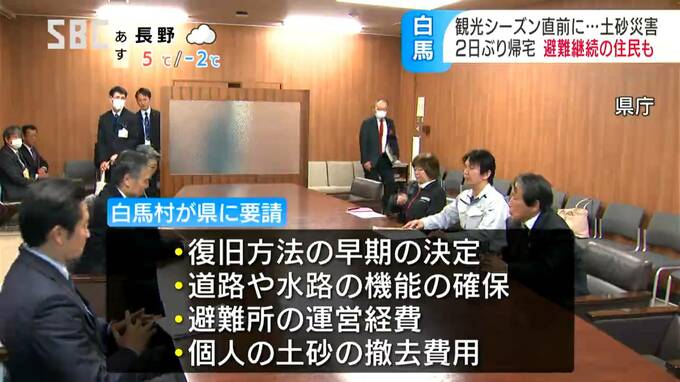 こうした状況を受けて丸山俊郎(まるやま・としろう)村長は県庁を訪れ、「復旧工事の方法を早急に決めること」や「道路や水路の機能の確保」、また「避難所の運営経費」や通常は自己負担となる「個人の敷地内の土砂の撤去費用」などについて、阿部知事に支援を求めました。