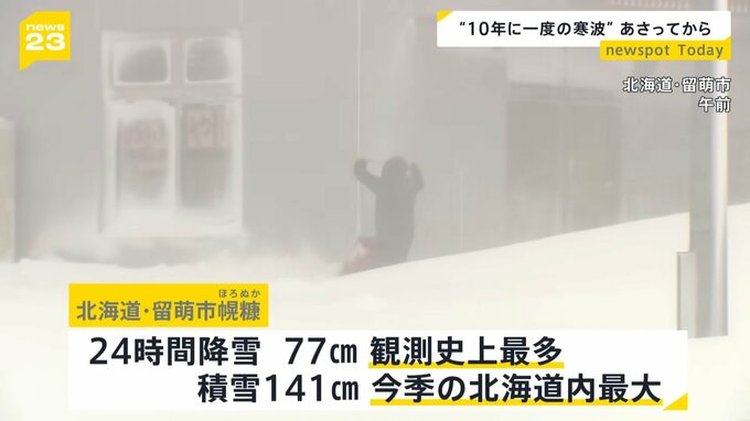 北海道では日本海側の一部でホワイトアウトが発生。留萌市幌糠では午前11時までの24時間で観測史上最多となる77cmの雪が降りました。積雪は140cmを超え、今季の道内最大を記録しています。