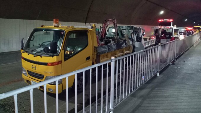 19日朝、山梨県の富士吉田市と富士河口湖町をむすぶ国道のトンネル内で合わせて6台が関係する事故があり、2人が病院に運ばれました。