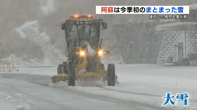 19日(火)朝の熊本県内は低気圧と寒気の影響で、阿蘇地方などでは今シーズン初めてのまとまった雪となっています。阿蘇市ではふもとの平坦部でも朝から雪が降り続き、復旧したばかりの阿蘇神社の楼門も初めての雪…