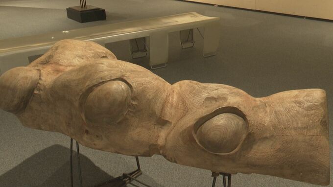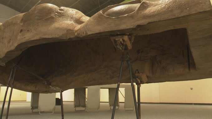 迫力ある木彫りは登さんの作品で、大きな丸太の内側を削り出して割れを防ぎ、軽くして運びやすいように制作されています。