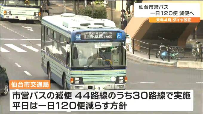 仙台市交通局は、バス事業の経営悪化に伴い、来年4月のダイヤ改正で平日の運行を1日120便減らすことを決めました。