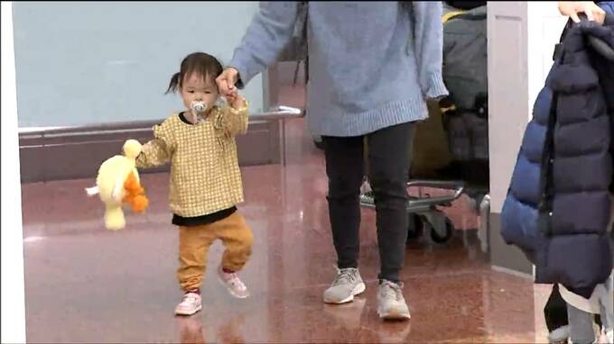 2歳の佐藤葵ちゃんは19日朝、お気に入りのぬいぐるみを抱いて両親と羽田空港に到着しました。