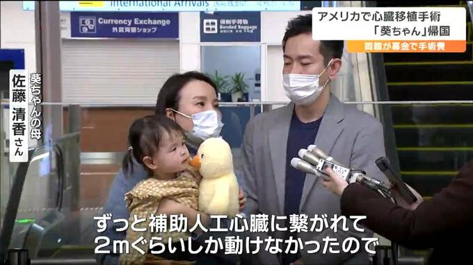 重い心臓病のためアメリカで今年8月に心臓の移植手術を受けた2歳の佐藤葵ちゃんがけさ、両親と一緒に元気に帰国しました。