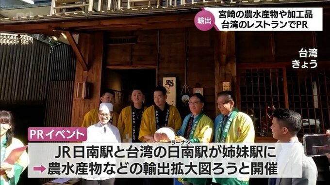 台湾のレストランで宮崎の農水産物などをPRするイベントが開かれました。これは、日南市にあるJR「日南駅」と台湾にある「日南(りーなん)駅」が姉妹駅となったことをきっかけに、宮崎の農水産物や加工品の輸出拡…