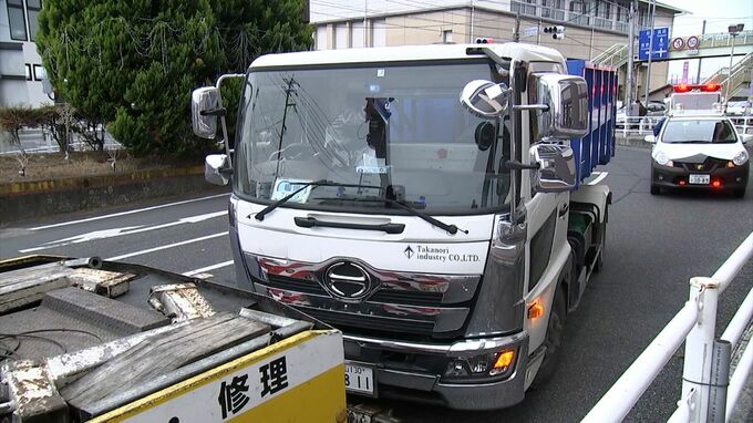 現場は大型商業施設前の国道交差点で、警察はトラックを運転していた男性から話を聞くなどして、事故の原因を調べています。