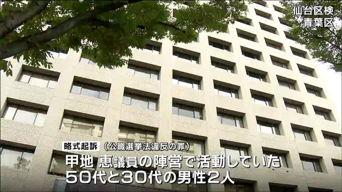 今年10月の宮城県議会議員選挙で初当選した甲地恵議員陣営の関係者が、選挙の告示前に有権者に対し投票を呼び掛ける封書29通を郵送したとして、公職選挙法違反の罪で19日、略式起訴されました。