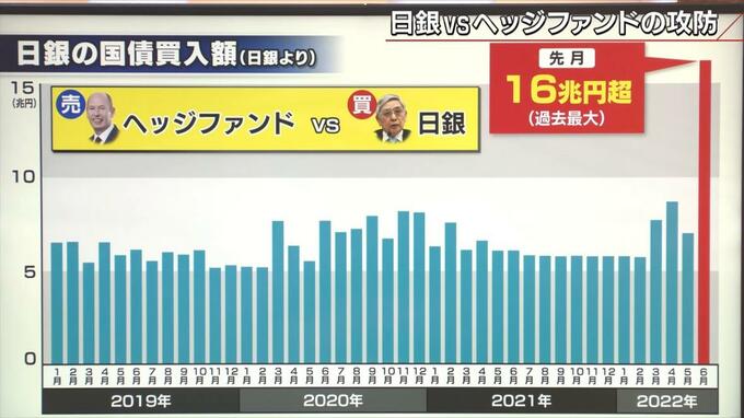 この急激な“買い”の裏に何があったのだろうか…実はこの時期、海外の大手ヘッジファンドが日本国債を大量に売りに出していて、国債の価値を下げないように日銀が買い支えた結果だとみられている。ではヘッジファンドは何故日本売りを始めたのか?