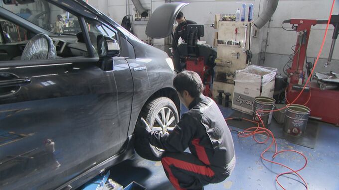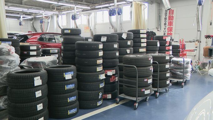「こちらの店ではタイヤ交換の予約が埋まってきていて、今週交換するタイヤが積み上げられています」