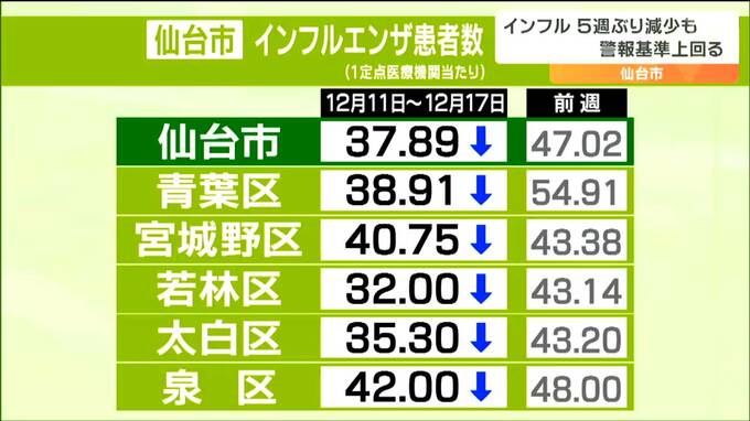 先週、仙台市内でインフルエンザと診断された人は1医療機関あたり37.89人と5週ぶりに減少しましたが、警報基準の30人を上回っています。