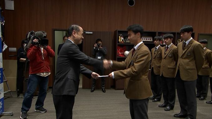 大森市長は激励金を贈り、「連覇へのプレッシャーはかかると思うが活躍を期待します」と挨拶しました。