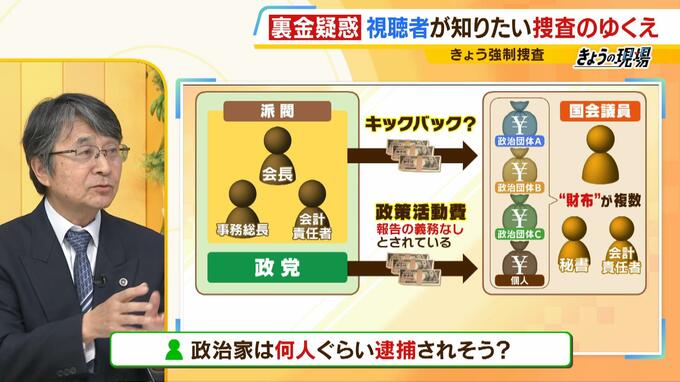「お金の流れとか、どんなことを指示されたかを例えば会計責任者や事務方は、叱責されたら困るから、間違いなく何かを残していると思います。捨ててしまうのかどうかは次のステップ。自分の責任について触れておくものだからやっぱり残しておきたいんですよね、記憶だと、証拠にならないので。あとLINE・メール、議員と事務方とのやり取り、事務方同士のやり取りの中で、『あの議員からこんなこと言われたんだけど』という話があったら間接的に相談があったという立証には繋がりますよね。大昔からやっているのだったらシステマティックにやれるから、事務方だけで済むんですよね。だから議員の意見を仰ぐ必要ないんですよね。しかし毎年議員に渡す金額が違うかもしれないし、色々なやり方するのだったら毎年方向を考えなければいけないから事務方では判断できないので、上に決裁を仰ぐという流れになるんですよ。だから、誰が考えてたのかが非常に重要なポイントです」