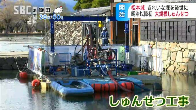国宝松本城のお堀にたまった泥などを取り除くしゅんせつが始まりました。記録が残る明治時代以降、初めての大規模工事です。松本城の天守を囲み整備された堀。湧き水が水源ですが、長い年月の間に堆積した泥で浅く…