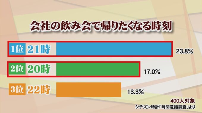 調査によりますと、会社の飲み会で「そろそろ帰りたいな」と感じ始める時間は、「午後9時」と答えた人が最も多く23.8%、2位が「午後8時」で17.0%、3位が「午後10時」で13.3%という結果となっていました。
