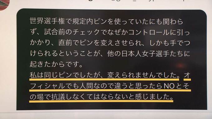 まず自分は海外にいることが多いので海外の選手はオフィシャルに言って、だめと言われても、“納得いかなかったら必ずSNSでも抗議文を出す”んですよね。そういうのを見てて、今回、日本人選手がそういうことになったにもかかわらず、詳細をあまり表に出さなくて、また、このあと世界大会ももちろん続きますし、また若い世代が初めて世界大会に出るっていうふうになったときにこの経験をまた日本人が繰り返すっていうのはどうかなっていうふうに思いました。ただピンを変えられました、悔しかったですで終わっちゃうのも、なんか違うなっていうのを私は当事者ではないんですけど、今後の日本チームがより世界の大会に出て活躍するためにその情報が必要になると思ったので発信させていただきました。