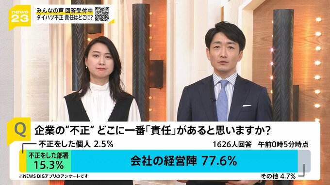 NEWS DIGアプリでは『企業の「不正行為」一番の責任はどこか』について「みんなの声」を募集しました。