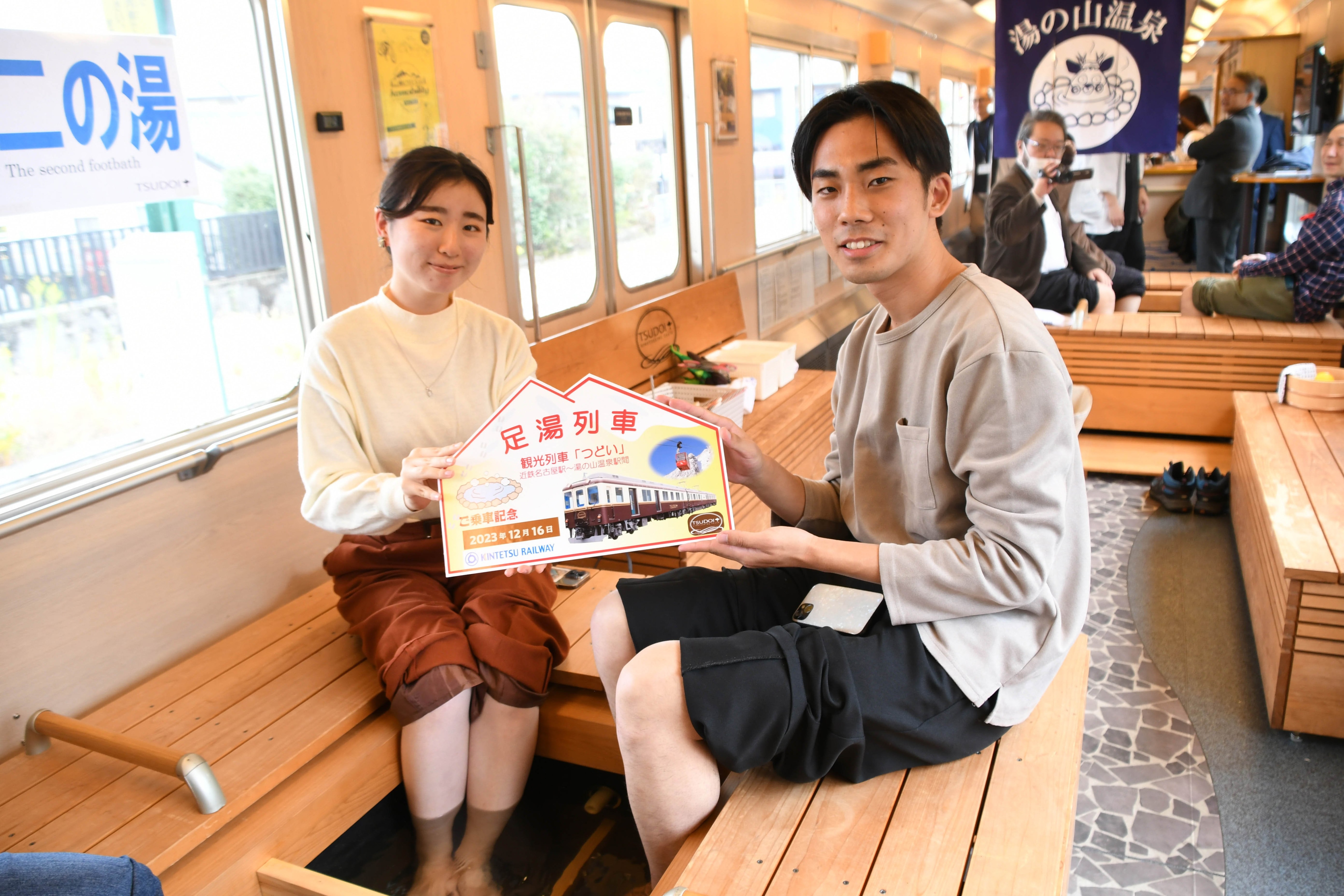 観光列車「つどい」の車内で足湯が体験できる「足湯列車」を4年ぶりに運行。