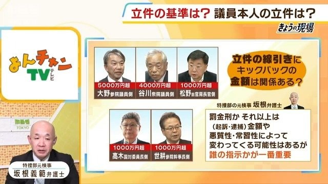 (坂根義範弁護士)特捜としては、組織ぐるみと見てるので、事務総長レベルの議員さんや派閥のトップを逮捕しなければしょうがないと思ってるはずで、いわゆる末端の、受けた側の議員さん、1年生議員さんとかで終わってしまえば、トカゲの尻尾切りになるんだという世間の批判を受けるのは特捜部は覚悟してますので、おそらく上層部まで行かなければいけないという意気込みであることは間違いないと思います。