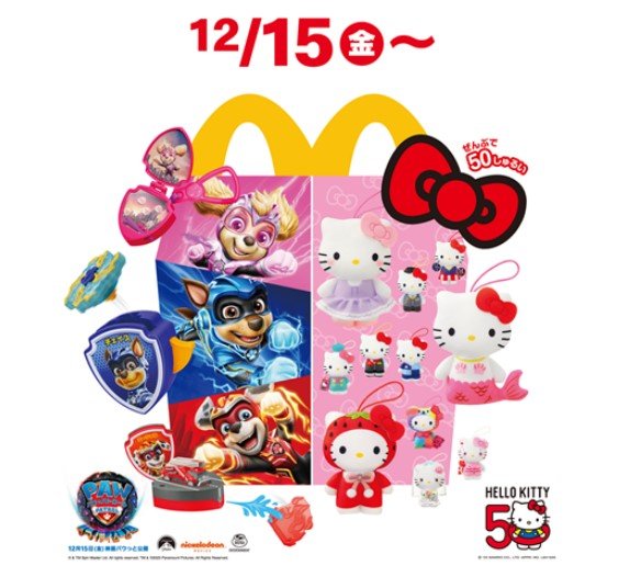 日本マクドナルドでは12月15日(金)からハッピーセット(R)「ハローキティ50周年」を販売。ハローキティの誕生50周年を記念した企画であり、ストラップ付きのキティのぬいぐるみがラインナップされています。