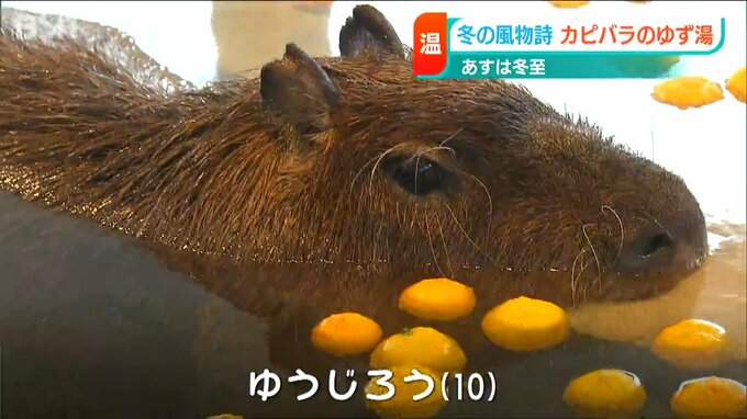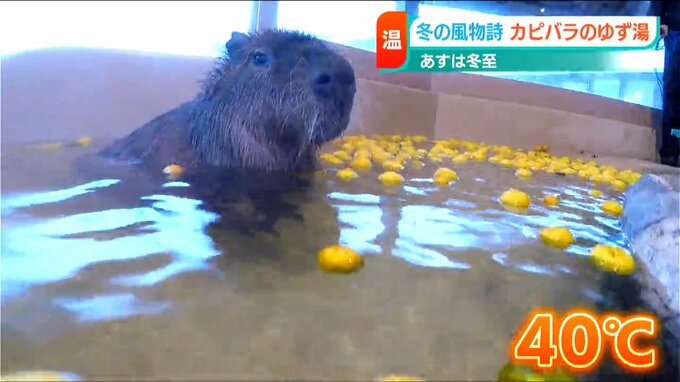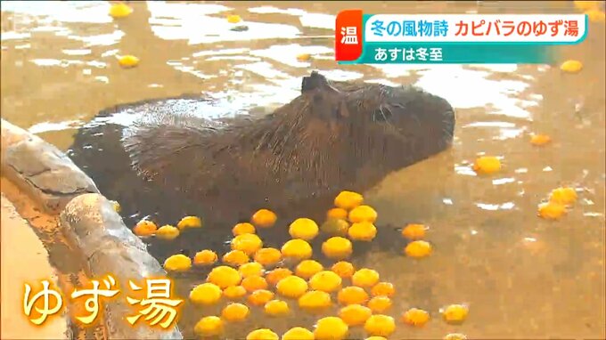 22日は二十四節気の一つ「冬至」。気持ち良さそうにゆず湯に入っているのは「カピバラ」です。
