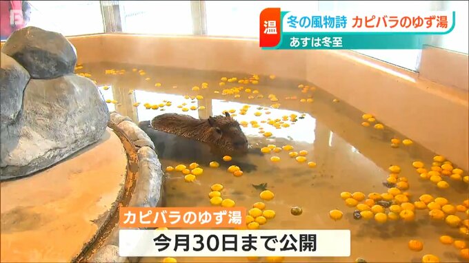 南米原産のカピバラは寒さに弱いため、動物ふれあいセンターでは冬を乗り越えてもらおうと毎年この時季にゆず湯をプレゼントしています。「カピバラのゆず湯」は今月30日まで公開しているということです。