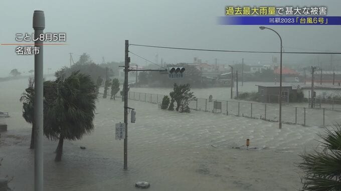 名護市のリゾートホテル近くのでは片側2車線の道路が冠水し、軽乗用車も水没。被害をもたらしたのは、台風6号です。