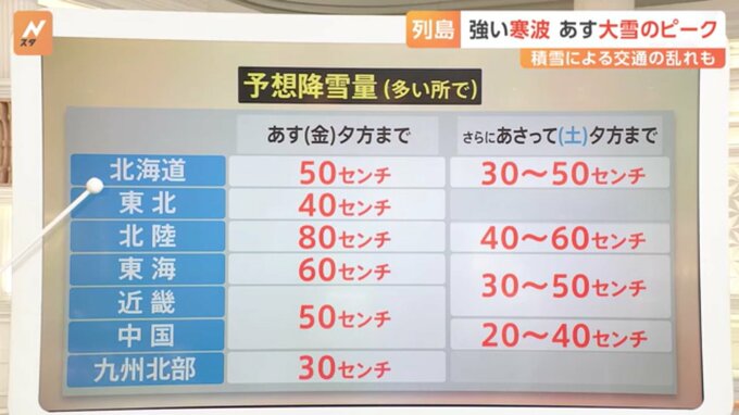 予想降雪量は一番多いのが北陸です。山沿いの数字で80センチ。平地でも60センチ以上降るところもあります。さらに次の日も、降り続けます。土曜日、午前中にかけてが大雪のピークになりそうです。