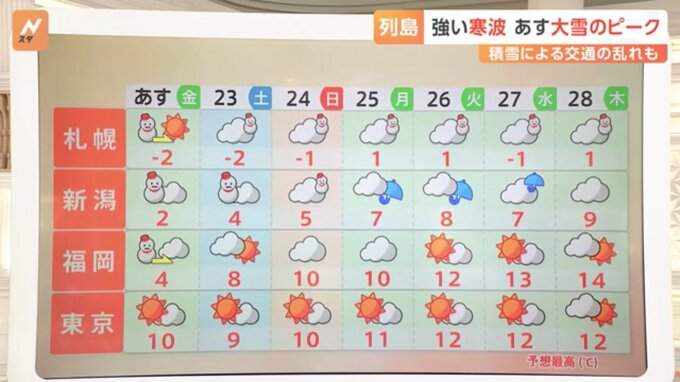 寒さも厳しいですが、東京は10度前後続きますが、福岡はあすまで雪に気をつけてください。