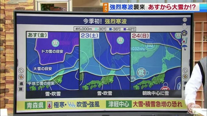 上空の寒気を重ねていきますと、上空5000m付近でマイナス36度以下(の寒気)は大雪の目安となっています。その強い寒気が北海道方面ではドカ雪の目安、大雪以上の激しい雪をもたらす寒気が北海道方面に。そして少し青森県の上空をかすめるような形になっています。22日(金)をピークに23日(土)、24日(日)とだんだんと抜けていきまして、24日(日)あたり雪の降り方、日中は落ち着いていきそうですけれども、この3日間でだいぶ雪の量が、特に津軽を中心に多くなると予想されています。大雪・積雪の急増の恐れが出てきました。