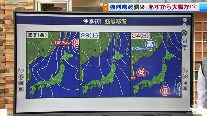 どうやらその影響は22日(金)、23日(土)、24日(日)この3日間となりそうです。22日(金)は冬型の気圧配置がだんだんと強まって23日(土)も縦じま、24日(日)になると緩んでくるという状況。