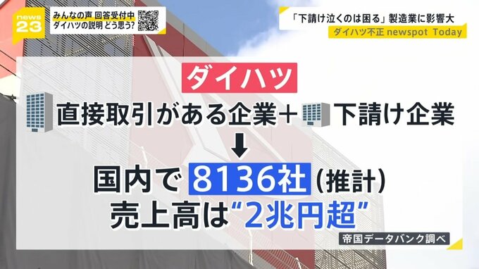 帝国データバンクによると、ダイハツと直接取引がある企業とその下請け企業は、国内で推計8136社。売上高は2兆円を超えるとみられます。